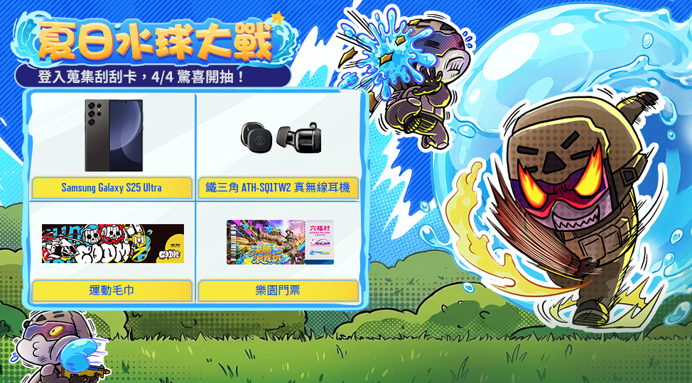 刮刮卡抽 Samsung Galaxy S25 Ultra、鐵三角耳機等豪華實體獎!4/4 登入領傳奇終極技能「淨化者 - 水喔水喔」。